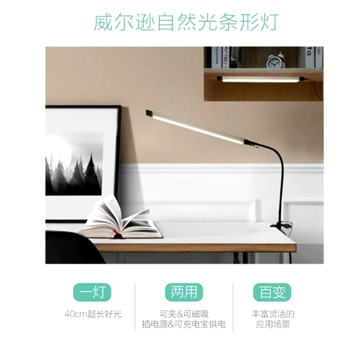 此款威尔逊台灯性价比超高、照明面积大、长度40CM市面的台灯一般12-19CM,可夹可吸,可插电源可用充电宝,适合书桌、餐桌、上下铺、钢琴、车里、床头、橱柜、衣柜等多个场景。
